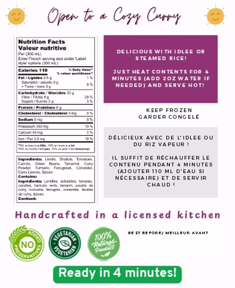 Toor Dal (Split Pigeon Peas), Tamarind, Tomato Powder, Onion, Drumstick, Carrot, Mustard Seeds, Curry Leaves, Turmeric Powder, Red Chili Powder, Coriander Powder, Cumin Seeds, Asafoetida (Hing), Salt, Fenugreek Seeds, Vegetable Oil.